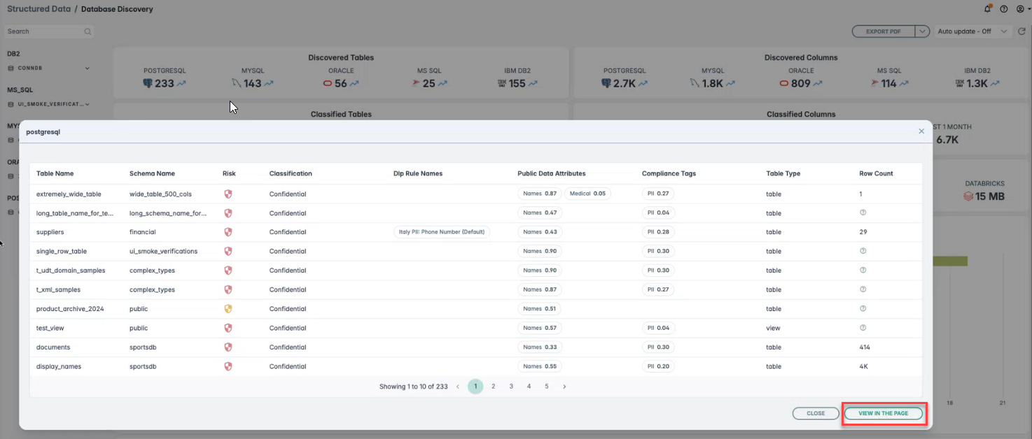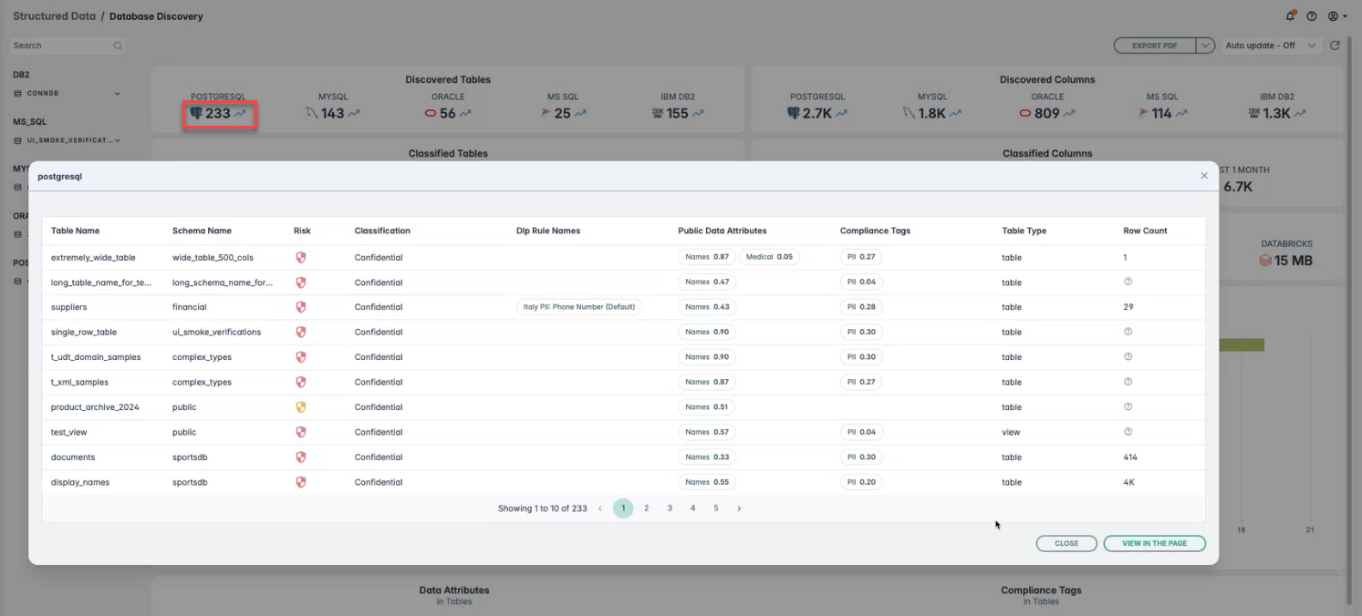 For example, clicking on the count (233) displays the total tables discovered from PostgreSQL database.