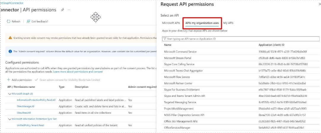 - APIs my organization uses > Microsoft Information Protection Sync Service > Application permissions > UnifiedPolicy.Tenant.Read