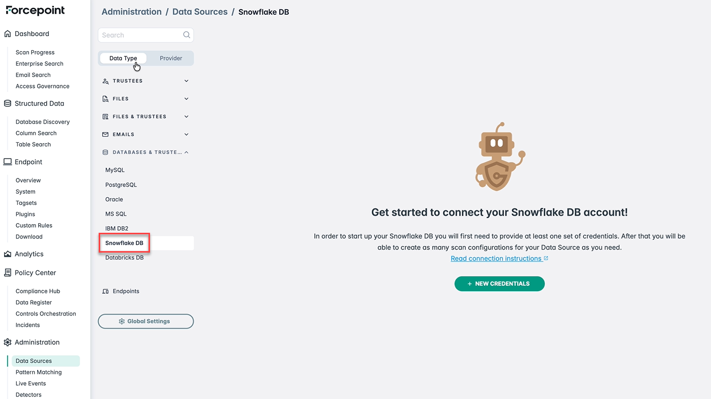 - Navigate to and select Snowflake DB under Data Type.