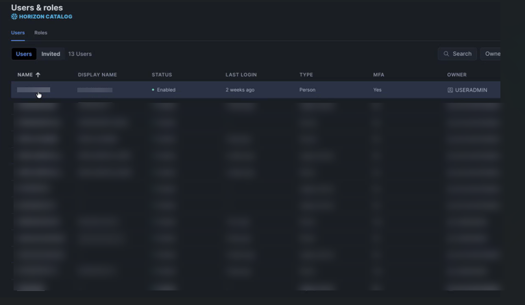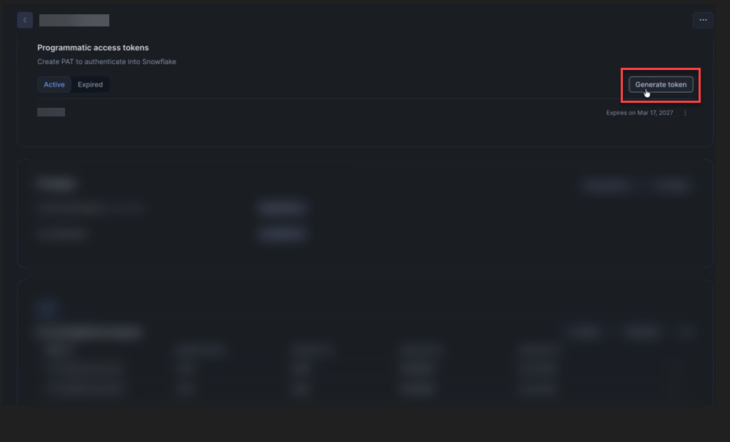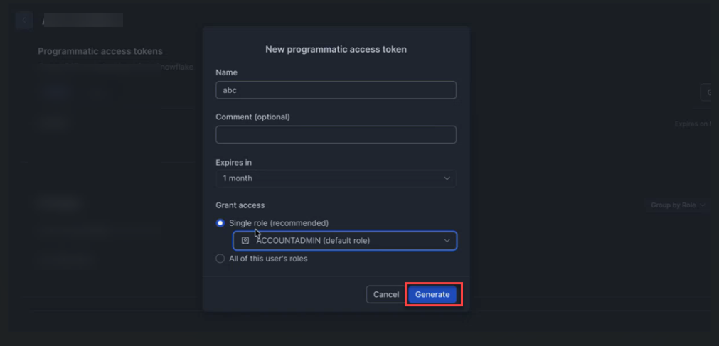 6 - Password*: Provide the programmatic access token.Note: Password field supports both password and programmatic access tokens. If Multi-factor authentication (MFA) is enforced on the user accounts, it is advised to use programmatic access tokens.To generate a programmatic access token, on Snowflake portal, navigate to , click any particular User and click Generate token.