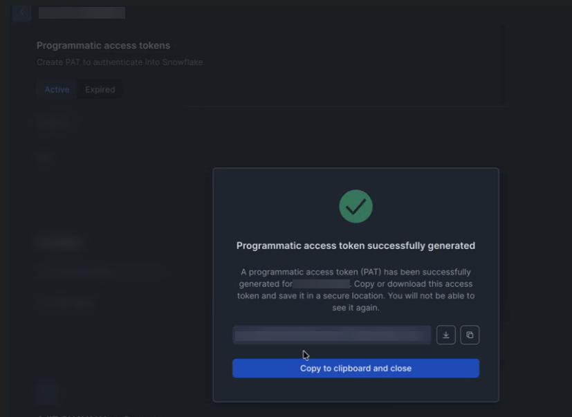 Programmatic access token is successfully generated now. Copy or download this access token and save it in a secure location.