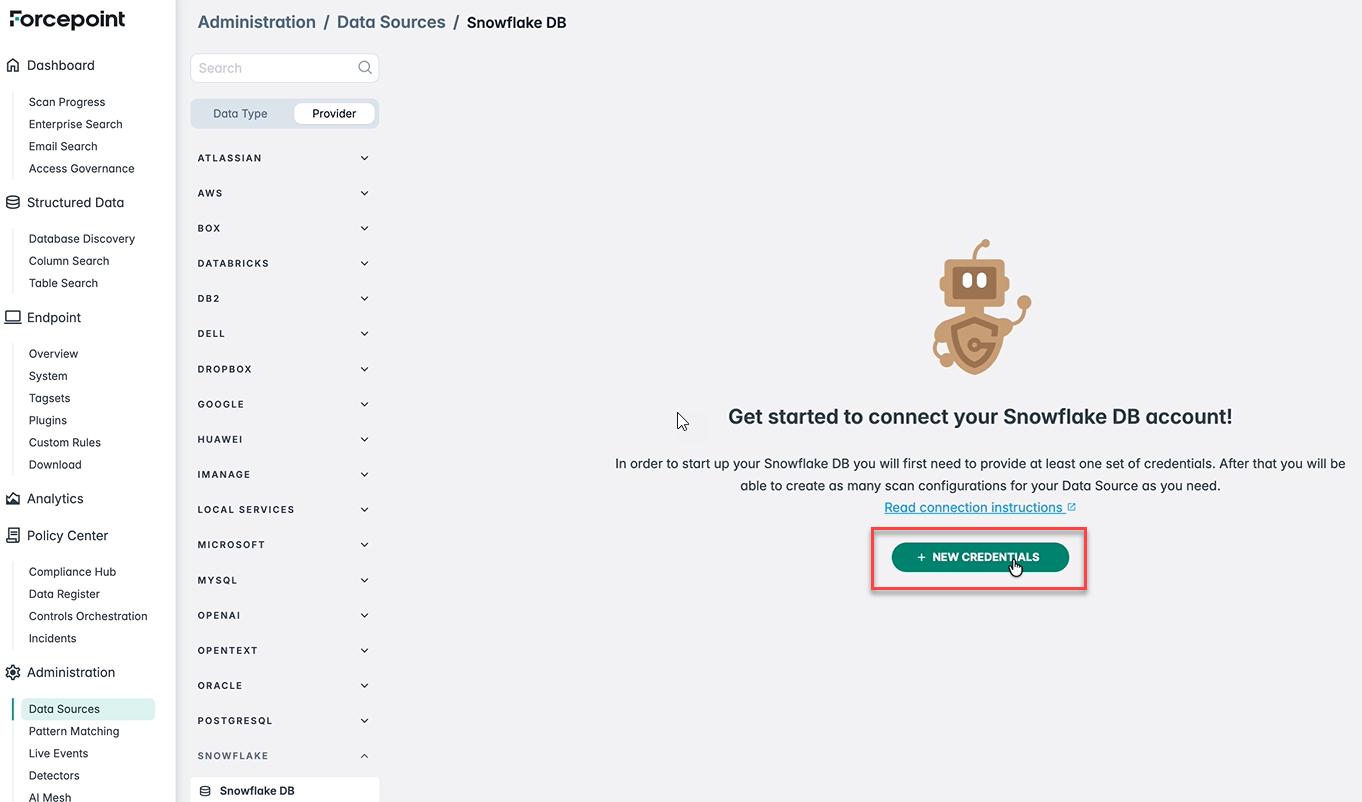 - Click NEW CREDENTIALS to create a new Snowflake DB credentials.