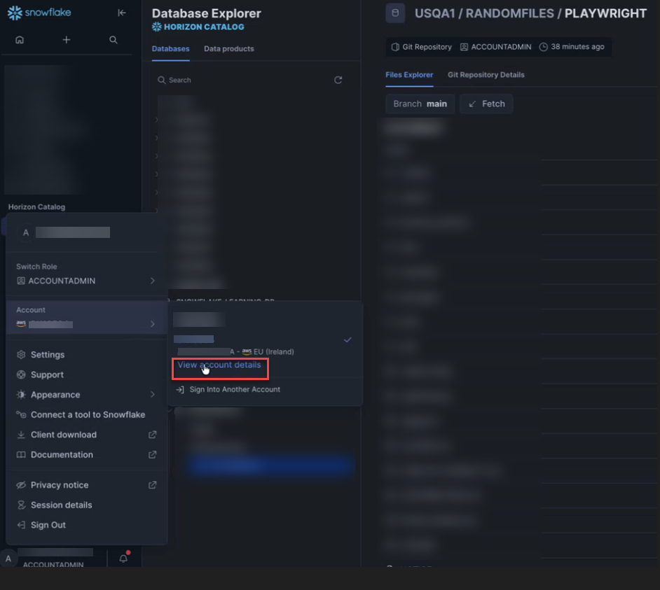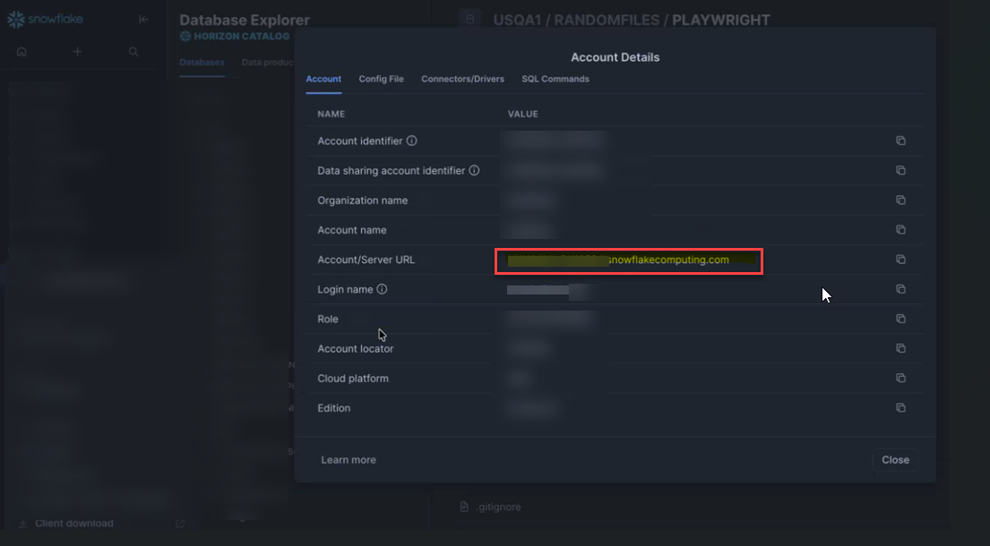 To get the Account/Server URL, navigate to Snowflake .