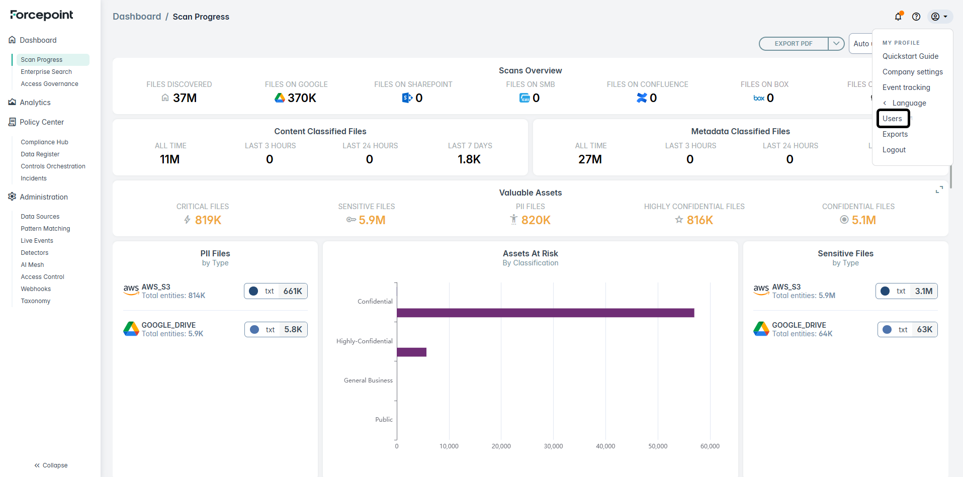 - Post log in, you will be directly taken to the DSPM pages. To navigate to the user management section on the Forcepoint Data Security Cloud, click the user icon, and click
