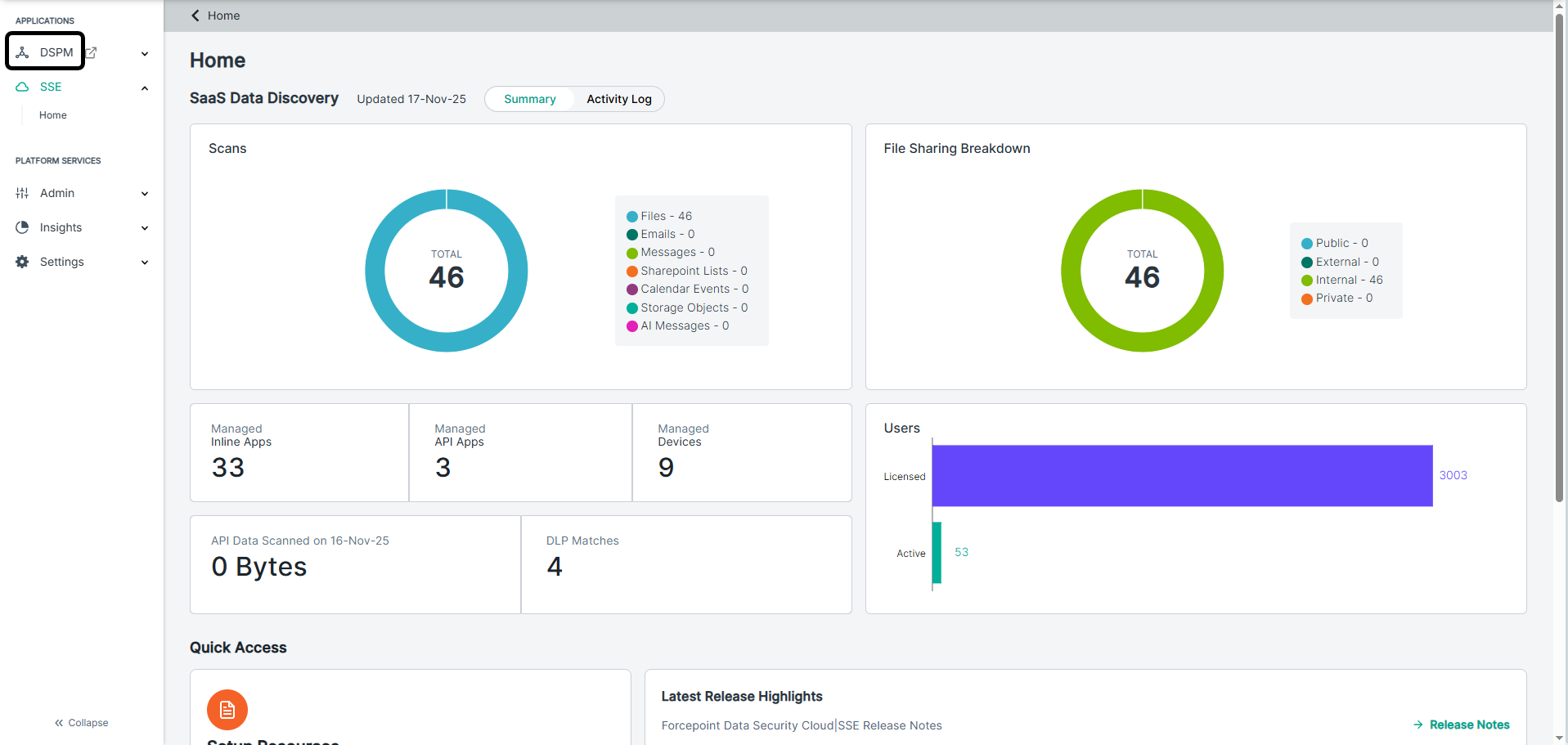 When a user logs out of the Forcepoint Data Security Cloud, the Forcepoint DSPM session they were logged in will be automatically terminated, thereby ensuring consistent log out behavior across both services.