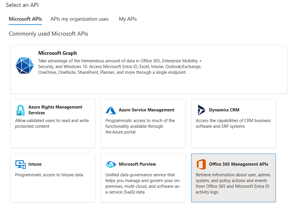 Permissions required - For Streaming Office 365 Management APIs > Application Permissions > ActivityFeed.Read and click Add permissions.