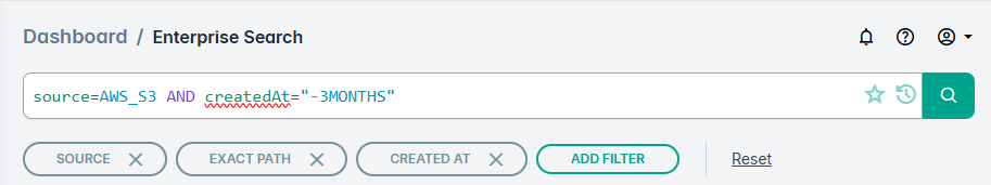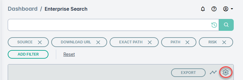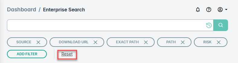 The Enterprise Search page also enables you to access recently used filters, save frequently used filters as bookmarks, and customize the column headings to create more meaningful reports.