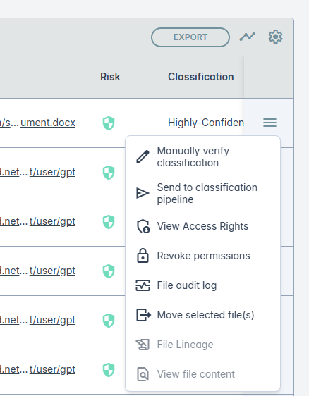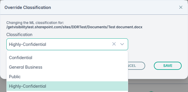 To adjust the machine learning classification of a file, click on the option Manually verify classification option from the hamburger menu. This opens the following window where you can modify the classification suggested by ML manually. After modifying the classification click SAVE.