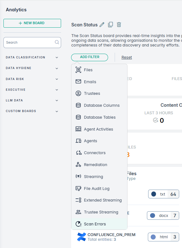 | 4 | Add filters to a board: Files, Emails, Trustees, Database Columns, Database Tables, Agent Activities, Agents, Connectors, etc.