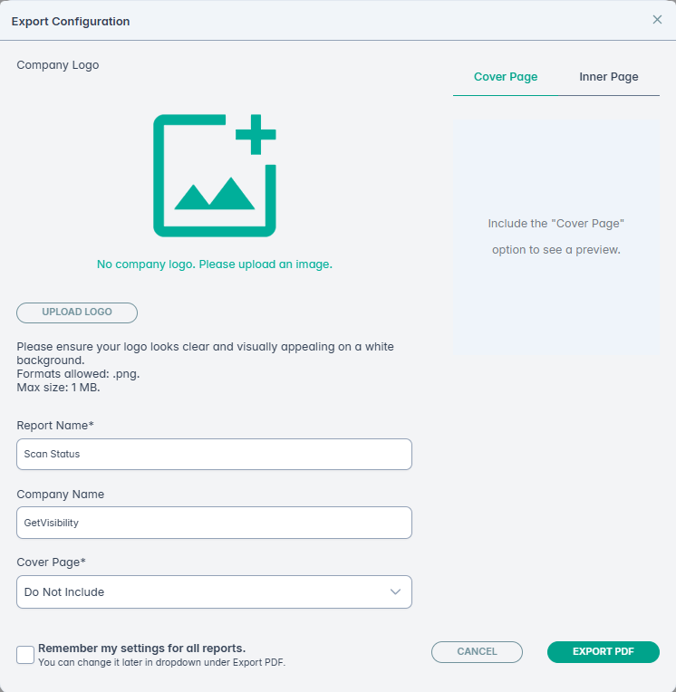 | 8 | Export PDF: You can export the report as a PDF or JSON. You can also set the Report Name, Company Name, Logo, and a cover page.
