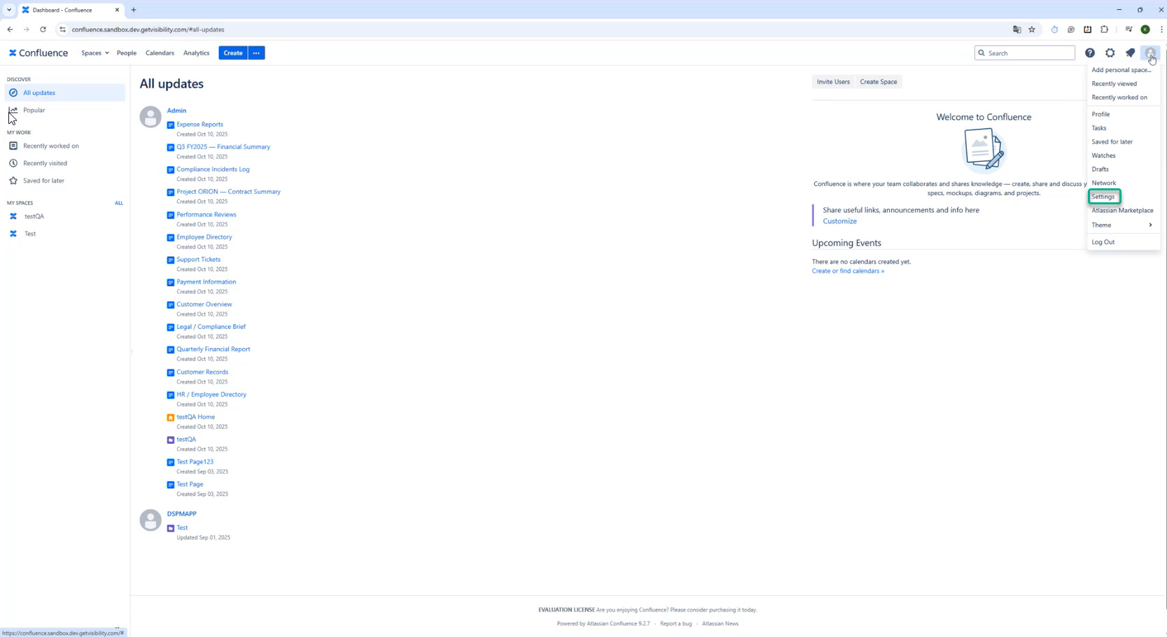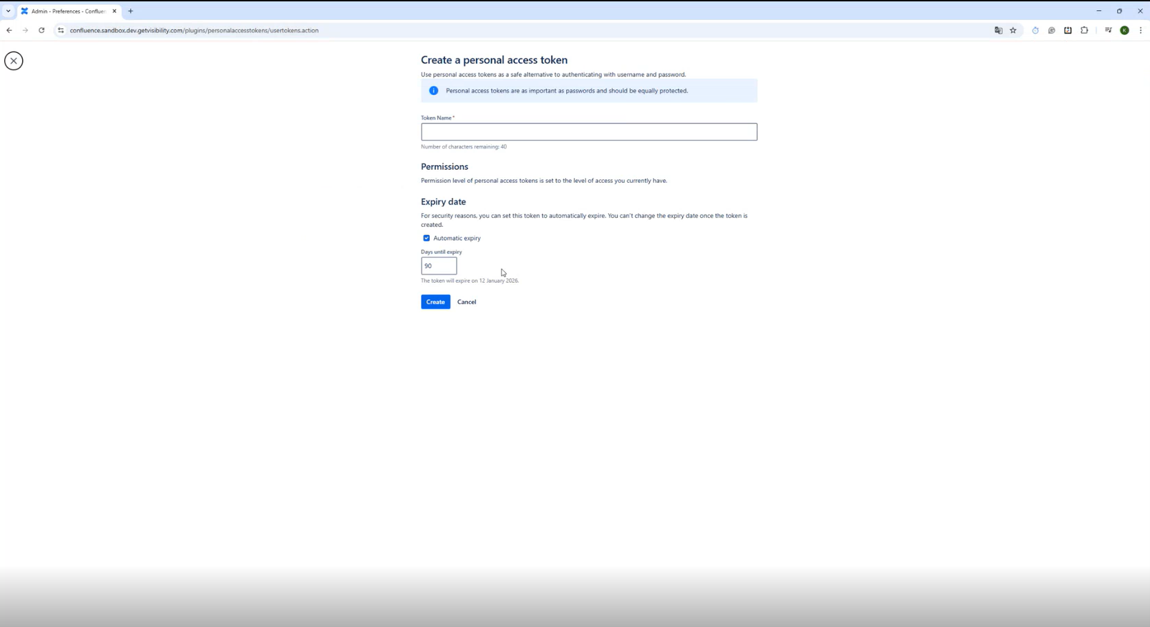 Generating an API token Steps Open the Confluence home page. Navigate to the Settings option under Profiles. Navigate to Personal Access Token tab click Create token: Enter a Token Name, optionally enter a value for the token expiry and click Create: Copy the token generated and close the screen.