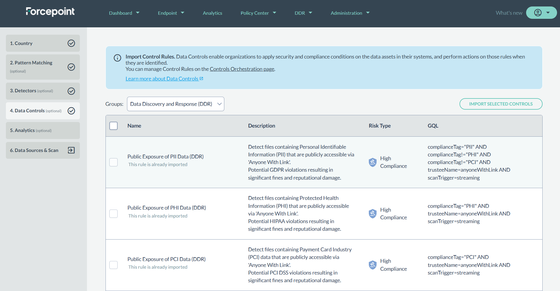Import Data Controls DDR offers a Quick Start option for enabling out-of-the-box data controls. Steps Go to Administration > Quick Start. Under the Data Controls section, enable predefined DDR rules, such as: Public Exposure of Personal Identifiable Information (PII). Detection of Protected Health Information (PHI). Monitoring of Payment Card Industry (PCI) data. Import the desired Control Rules to start monitoring immediately.