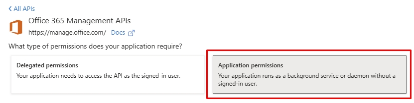 Office 365 Management API ⇒ Application Permissions ⇒ ActivityFeed.Read