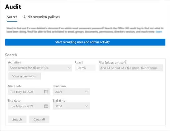 If auditing is not turned on for your organization, a banner is displayed prompting you to start recording user and admin activity. Select the Start recording user and admin activity banner.