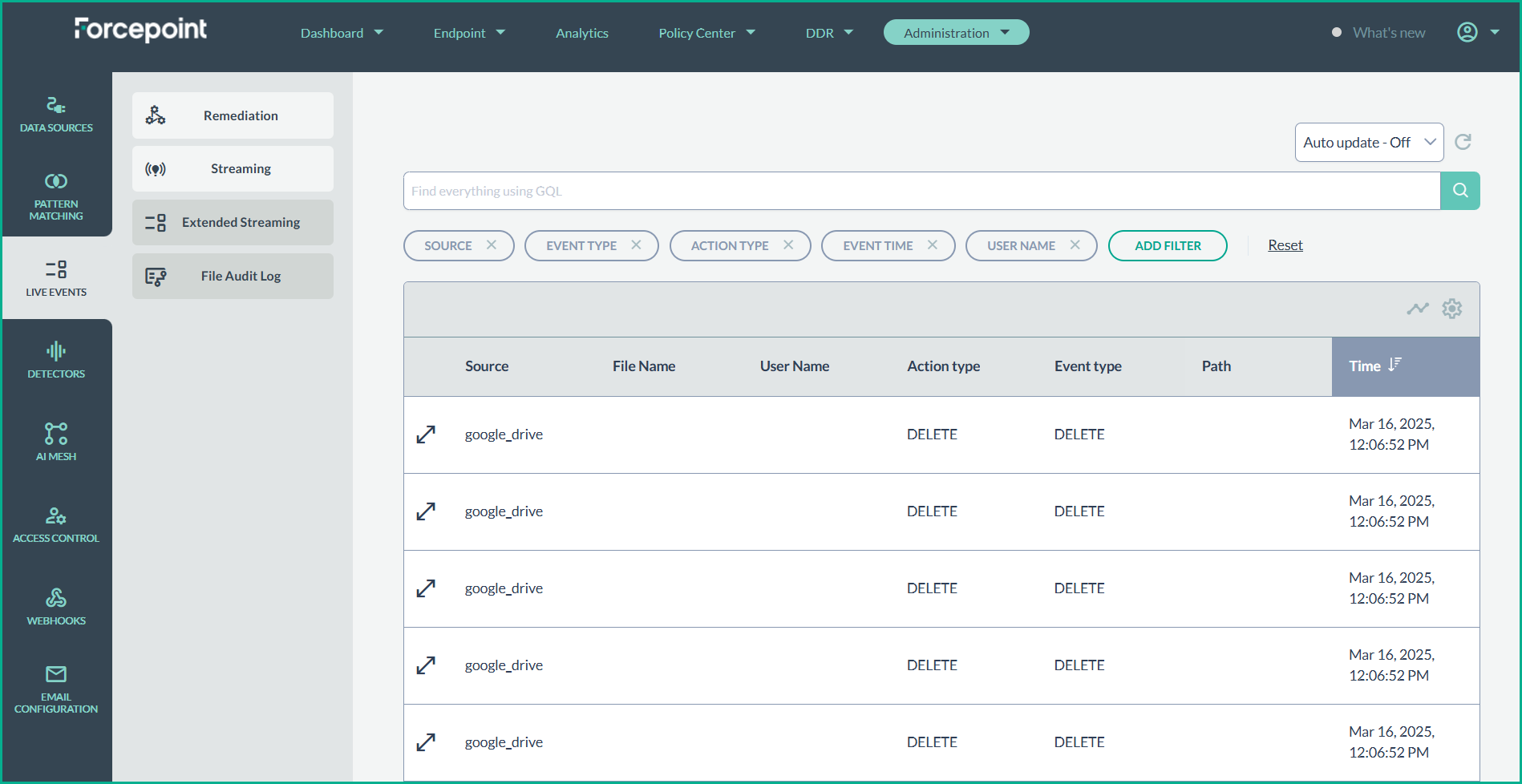 - Navigate to the Live Events section under Administration and then to Streaming tab to view a detailed audit log of