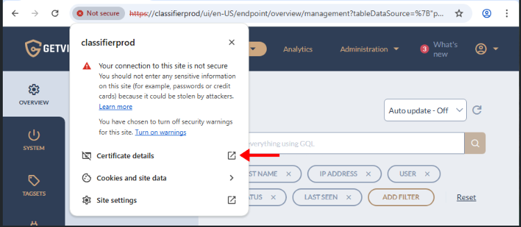 - Check for a warning: If a warning is displayed, proceed to the next steps. If no warning is shown, the machine already trusts the certificate, and you're good to