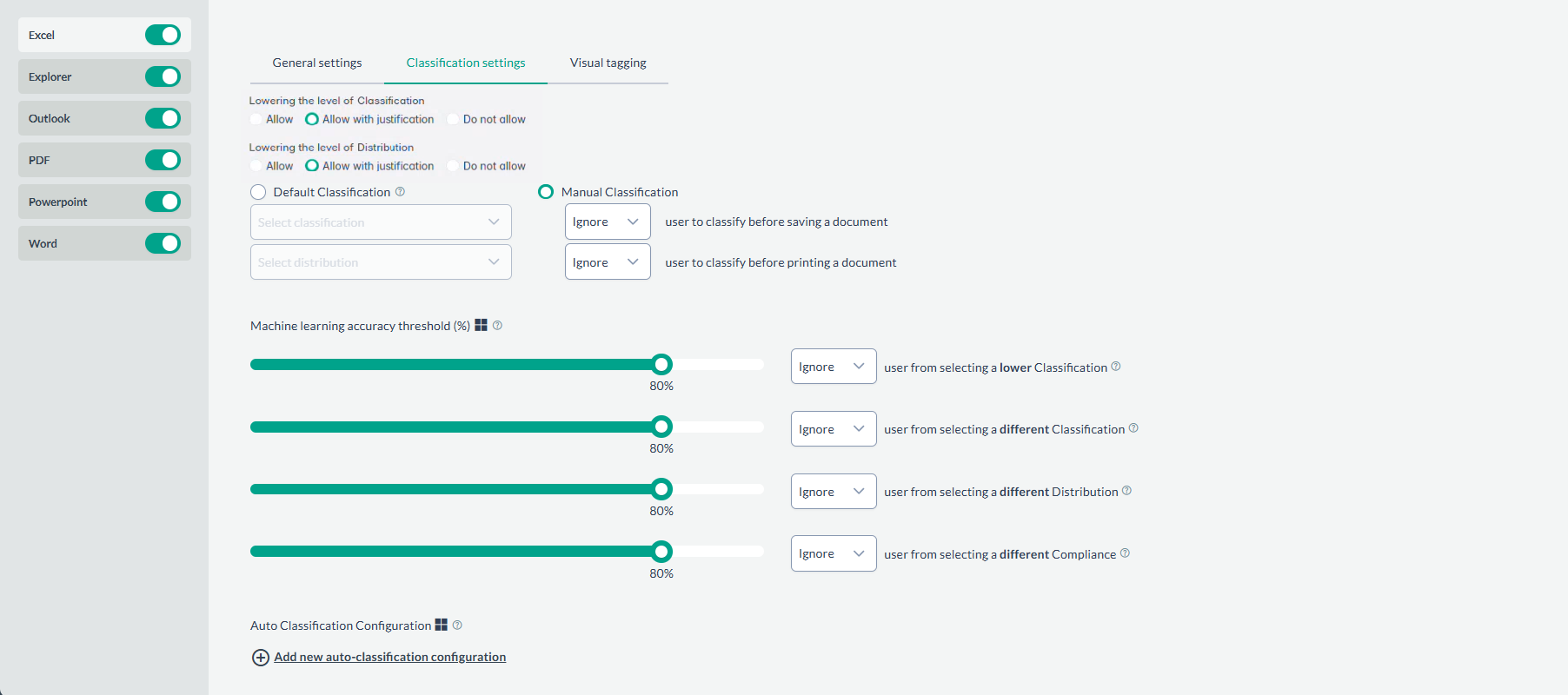 This feature enables users to automatically classify items based on machine learning (ML) suggestions. When the confidence level of an ML suggestion exceeds the chosen threshold, the selected classification, distribution, or compliance will be applied without manual intervention. Note: A new configuration can be added with the Add new auto-classification configuration button, to apply a different category, and select a different threshold as