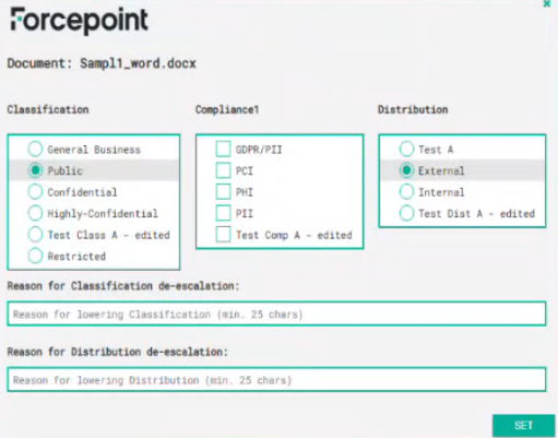 - Allow lowering the level of Classification: Classification can be changed to a lower level. For example, a file classified as Confidential is then classified as Public.