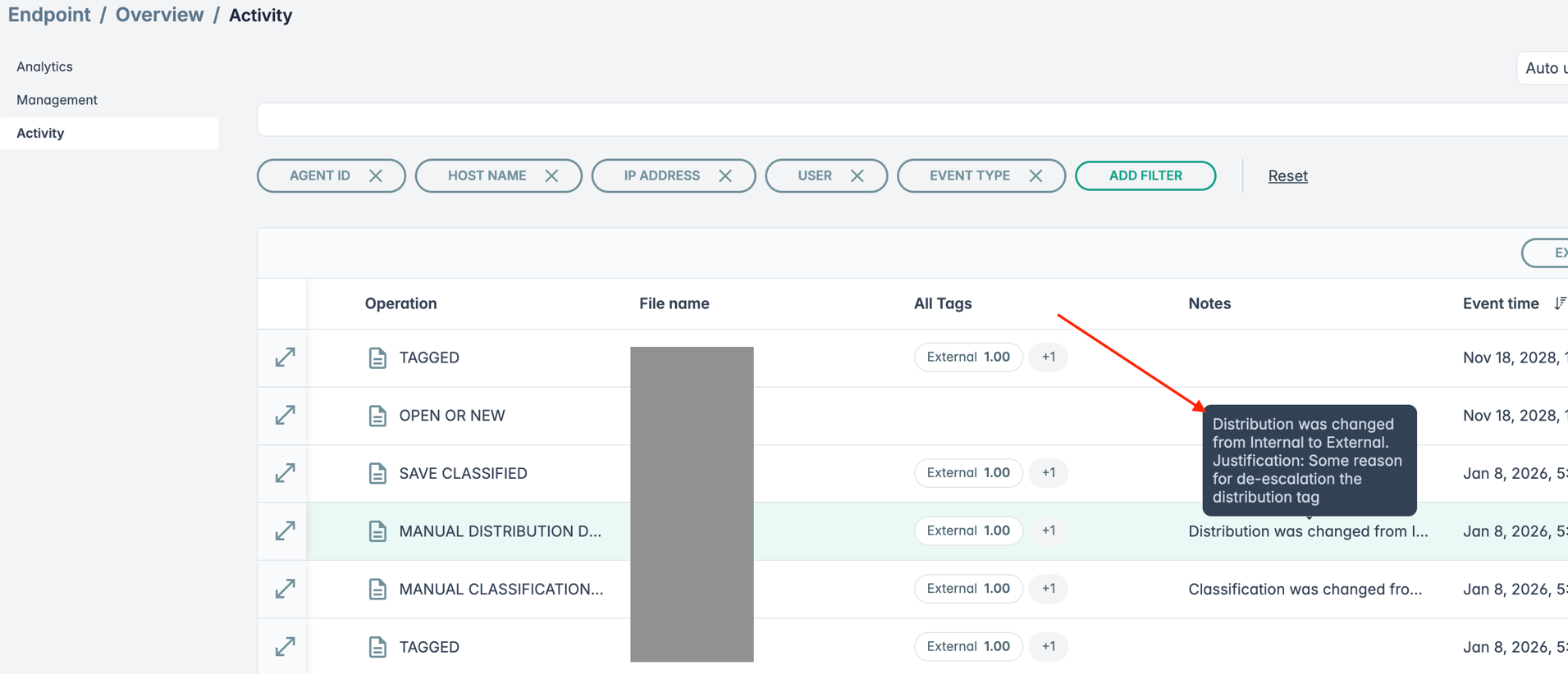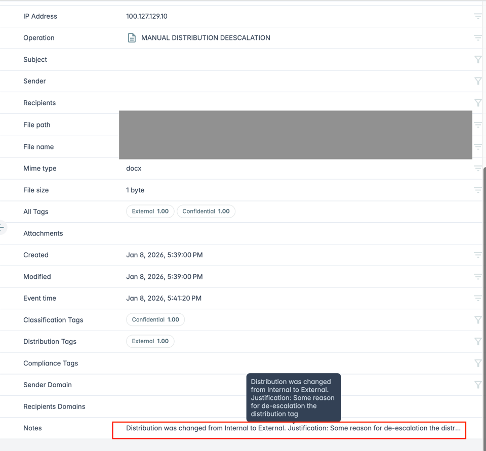 - Once the user made any Classification/Distribution de-escalation, the information will be displayed in Notes.