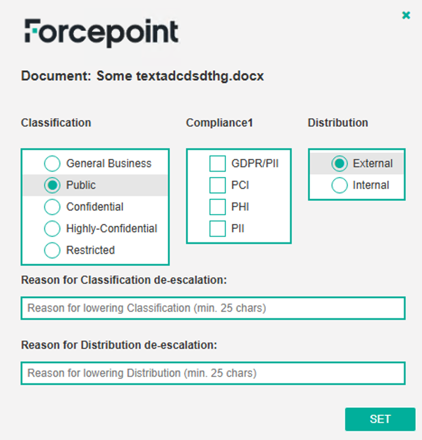 The user should be able to classify higher than Highly Confidential/Internal without any justification.
