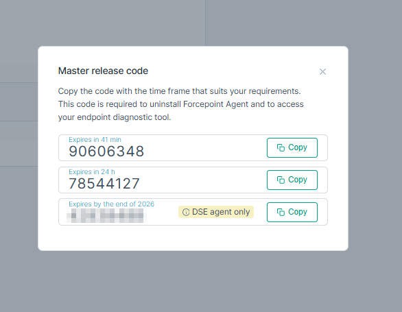 Note: The persistent release code only works for Forcepoint DSE v30.5.184 or newer.