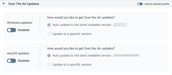 Displays which agent software versions are pushed to the endpoints. Values are inherited from default profile settings. Over the air updates can be enabled or disabled from the Default profile. Also, administrators can either opt for automatic updates or select specific agent versions to update from the Default profile. If Update to a specific version is selected, then the drop-down can be used to select the exact agent version of the agent to update to.