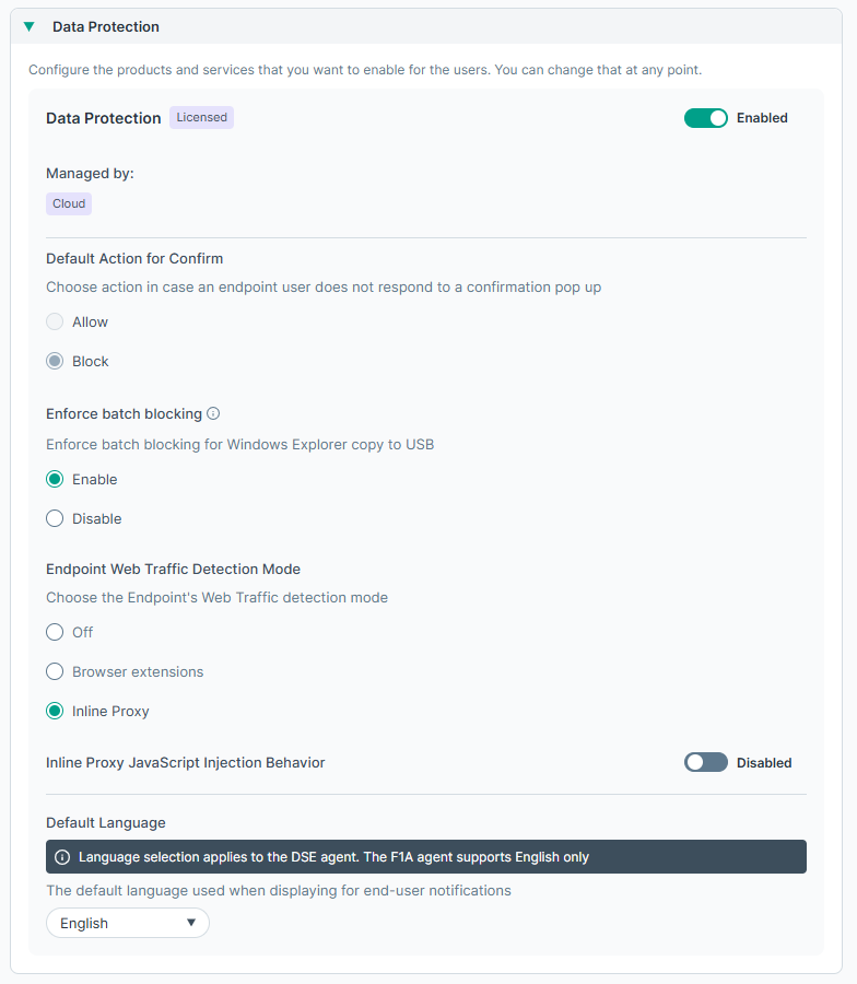The Endpoint Web Traffic Detection Mode sets whether to use Inline Proxy or Browser Extension. Since the Forcepoint agent currently supports only the Inline Proxy mode, the mode cannot be changed. When support for the Browser Extension mode is enabled for the agent, it will be possible to set the mode.