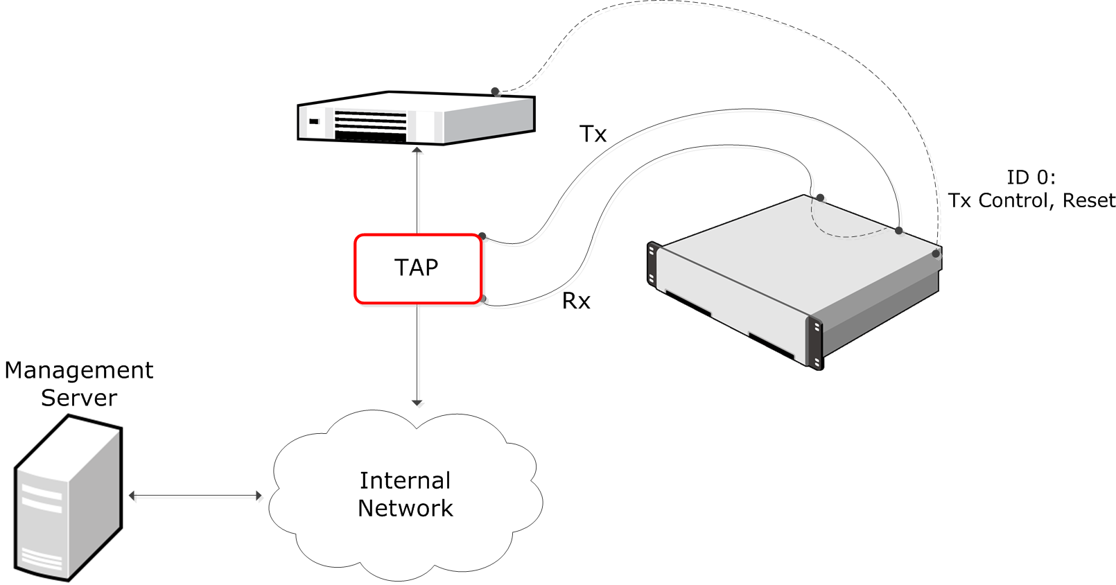 In this example, Interface ID 0 is a Normal Interface used for management connections, and sending TCP Reset responses. Interface ID 1 is a Capture Interface that listens to the received (Rx) packets from the network TAP. Interface ID 2 is a Capture Interface that listens to transmitted (Tx) packets from the network TAP. Interface IDs 1 and 2 share the Logical Interface, which combines the traffic from both physical interfaces so that it can be inspected as a complete traffic flow.