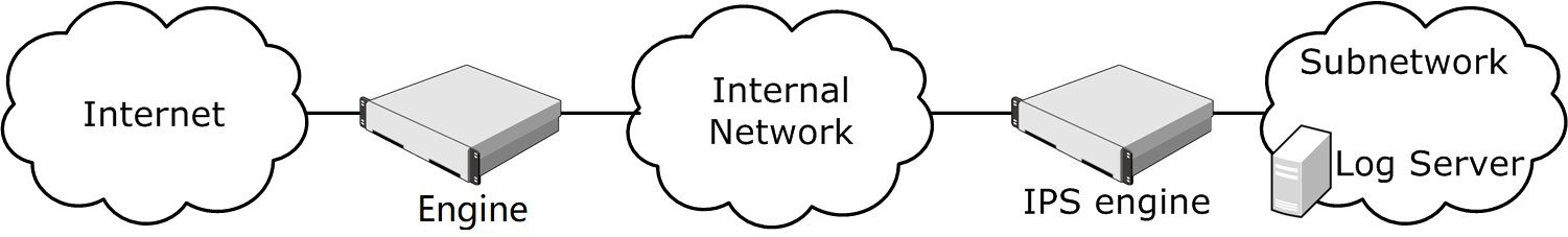 In the subnetwork, there are several servers that provide services to the general office network as well as the Management Server and Log Server. There is also a Engine deployed