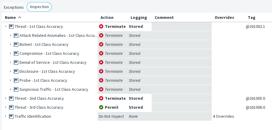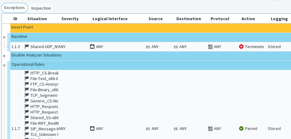 - The Inspection tab contains the main rules for finding traffic patterns. The Rules tree is applied to all traffic that is not handled as Exceptions.