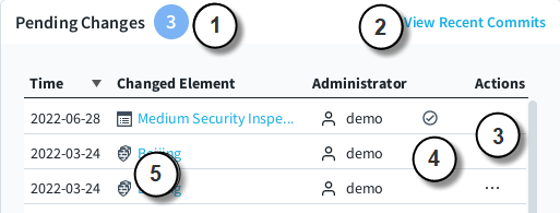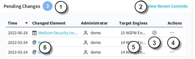 The Pending Changes pane shows configuration and policy changes that have not yet been transferred to the Security Engines. What the pane shows depends on whether an Security Engine's Dashboard page or the Dashboard view showing all Security Engines is open.