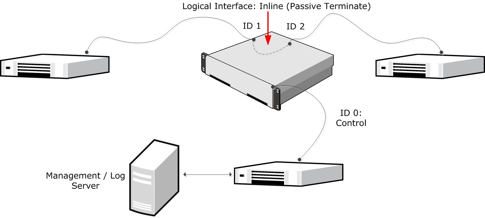 In this example, the IP address on Interface ID 0 is configured as the Control IP address for management connections. Interface ID 1 and Interface ID 2 are an inline interface pair that share the Logical Interface, called Inline (Passive Terminate). Traffic comes in through Interface ID 1 and leaves through Interface ID 2.