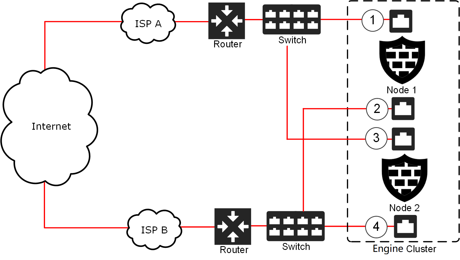 You can configure Multi-Link with a Engine Cluster consisting of two nodes by using two routers and two switches and physically connecting each node to each switch.