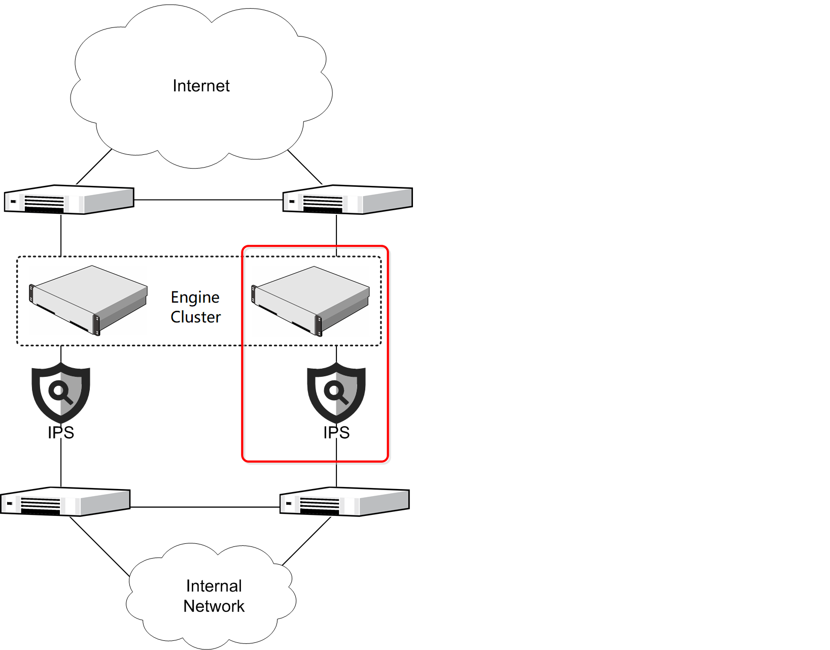 Figure: Redundant single inline IPS engines alongside a Engine Cluster