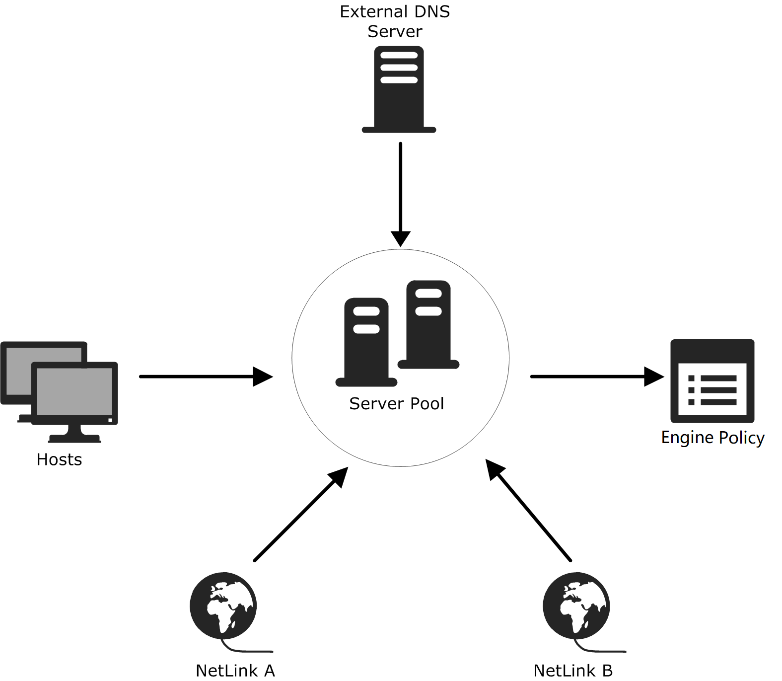 When dynamic DNS updates are used, the Security Engine updates the DNS entries automatically based on the availability of the NetLinks. When a NetLink becomes unavailable, the Server Pool’s IP address for that link is automatically removed from the DNS entry on the external DNS server. When the NetLink becomes available, the IP address is again automatically added to the DNS entry.