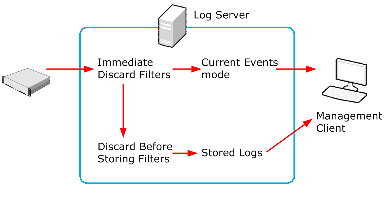 The engines send their logs to their configured Log Server. The Log Server either stores the log entries or just relays them to be viewed immediately in the Current Events mode in the Logs view. Some logs might be discarded through pruning before these operations. When you view logs, the information is fetched directly from the Log Servers. Some other tasks, such as processing data for statistical reports, are also partially carried out by the Log Server.