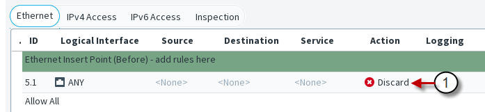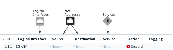 This illustration shows an Ethernet rule that has been inserted into the policy. The Source, Destination, and Service cells are set to NONE, so this rule does not until they are changed to ANY or a more specific value. The Logical Interface cell is also matched against traffic, but it is not mandatory to change it if you want the rule to apply regardless of the interface. The other editable cells specify further conditions and options for handling matching connections. It is not necessary to edit all cells in each rule. Ethernet rules are read from the top down. More specific rules must be placed above more general rules that match the same traffic.