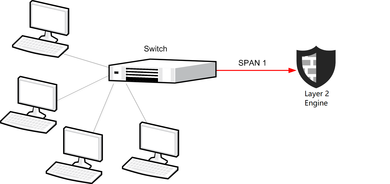 In a capture mode installation, packets are duplicated for inspection through a SPAN or mirror port on a switch/router. In a Layer 2 Engine Cluster, each node must be connected to a SPAN or mirror port of its own.