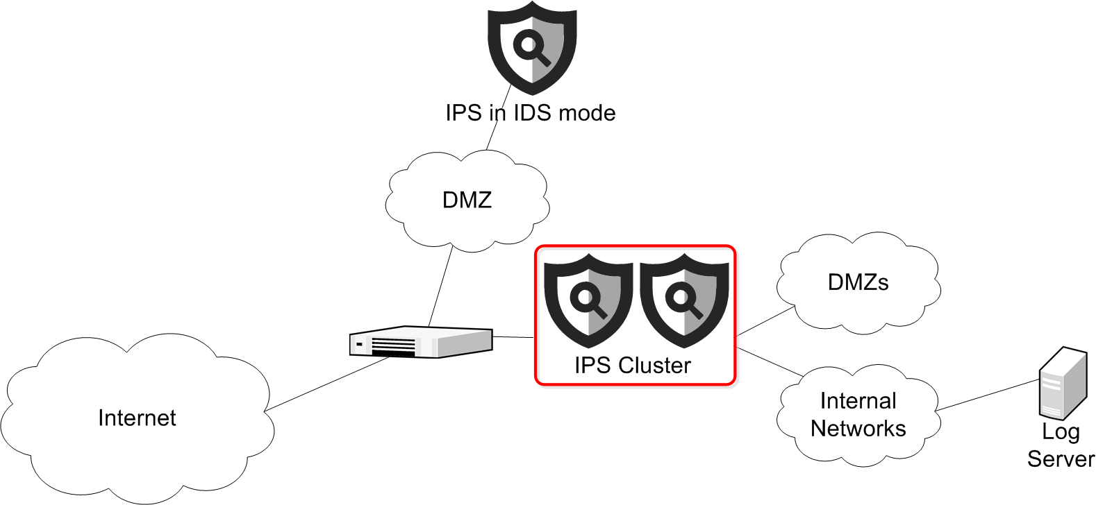 - The IPS Cluster is placed in a dedicated DMZ for security.