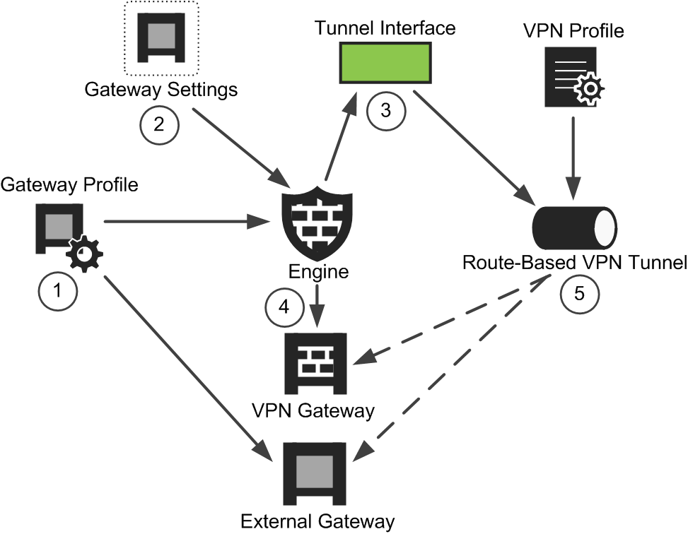 Due to the various authentication and encryption methods that the IPsec protocol supports, the number of settings is rather high. To reduce configuration work, you can use reusable profiles for storing different types of settings. These and other elements related to Route-based Tunnels configurations are pictured in this illustration.