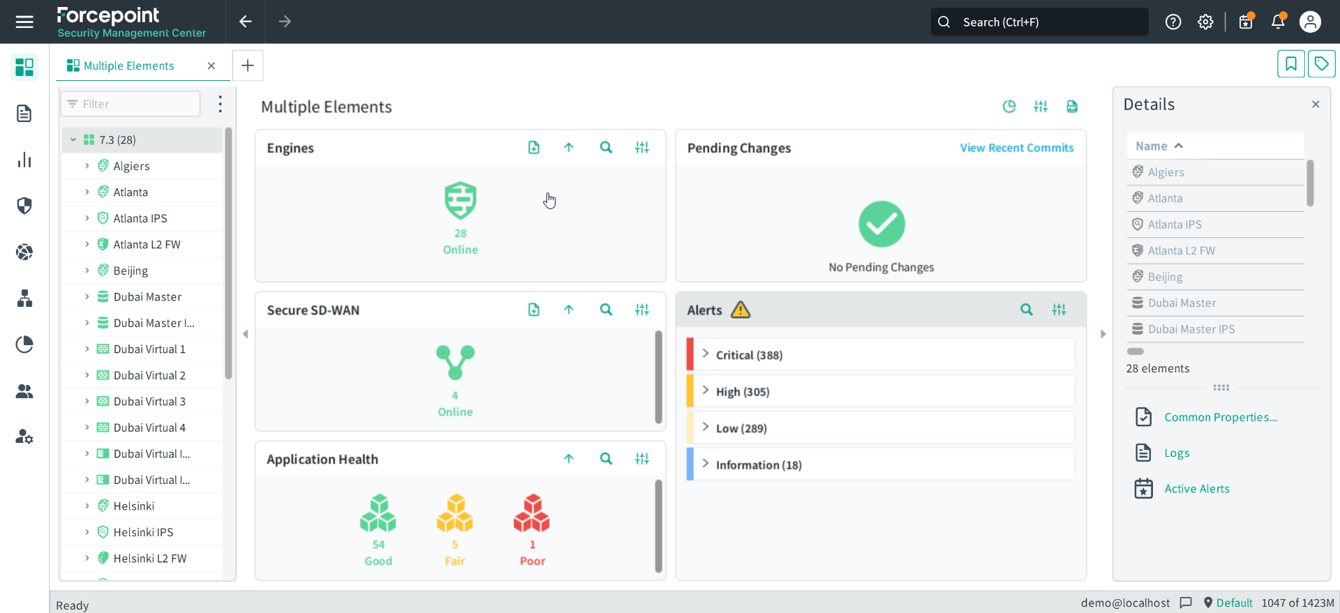 - Status cards for Security Engines, VPNs, and other monitored elements or the Home page for the selected element show detailed information about the status and configuration of monitored elements.