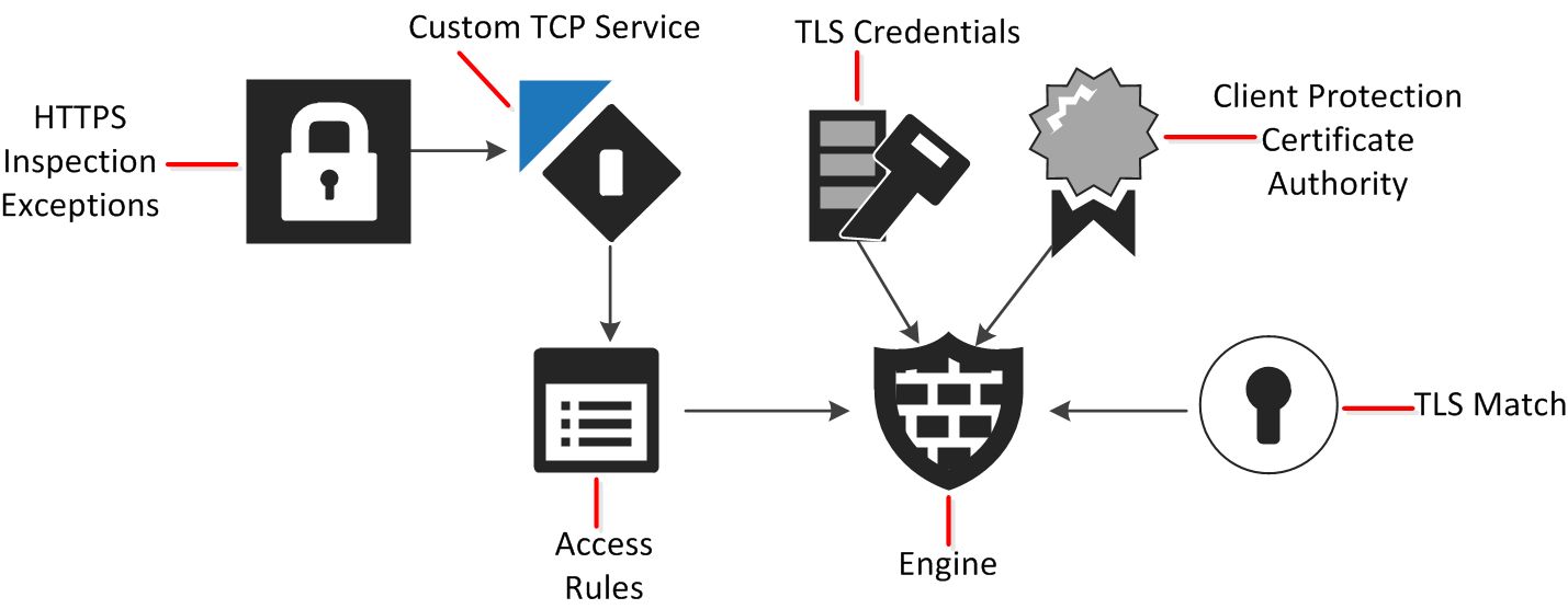 To use TLS inspection, you must configure TLS Credentials elements and Client Protection Certificate Authority elements. You must also activate client protection or server protection in the engine properties and enable TLS inspection in the Access rules.