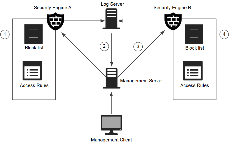 - Management Servers relay manual block listing commands from administrators, and block listing requests sent by Log Servers to the Security Engines.