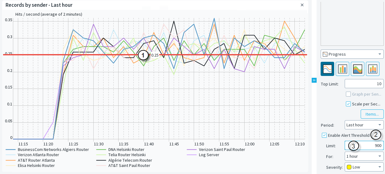 For Top Rate and Top Rate Curve items, the highest value is compared to the threshold limit. The threshold is considered exceeded if the highest value is above the threshold limit during the tracking period. If the threshold limit is exceeded, an alert is sent.