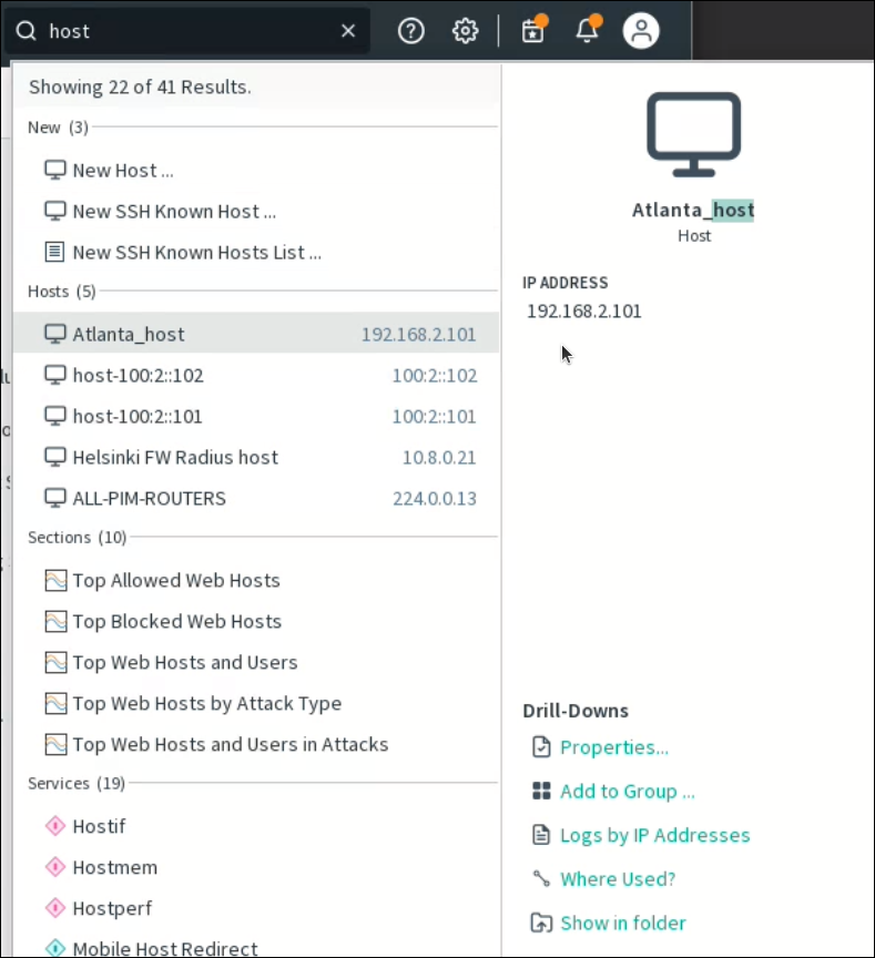 The search results are grouped and ranked by relevance. When editing an element or a policy, you can drag-and-drop elements from the search results list. You can also perform tasks from