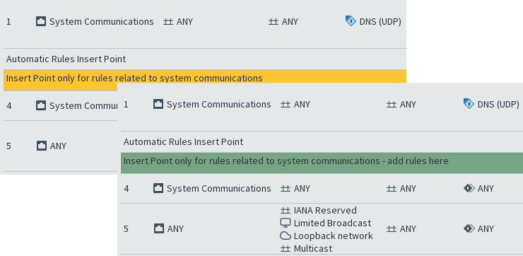 This illustration shows what the same insert point looks like in a Template Policy and in the inheriting policy elements. The color of the insert point indicates whether the insert point has been added in the current Template Policy for inheritance to lower levels (orange) or whether it has been inherited from the higher-level Template Policy (green). Only the orange insert points are inherited to lower-level policy elements. You must add at least one new insert point at each Template Policy level to make the lower-level policies editable. When you add the first new rule to the green insert point, the rule replaces the insert point. Any number of rules can then be added directly above and below that first rule. The engine reads rules in order from the top down. The rules above the insert point in the higher-level Template Policy cannot be canceled by anything a lower-level policy adds into the insert point.
