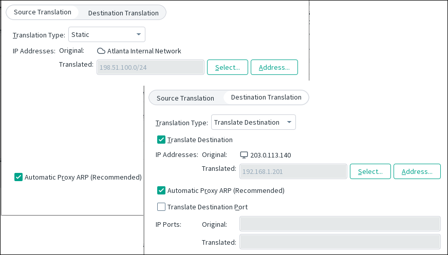 Example of a combined source and destination translation NAT rule