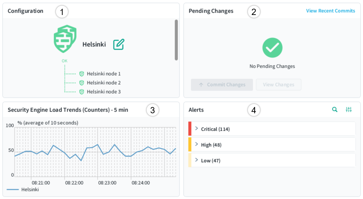 - The Pending Changes pane shows configuration and policy changes that have not yet been transferred to the Security Engines. Provides options for viewing, approving, and committing pending changes. The Recent Commits pane shows recent policy uploads. It opens in the same place as the Pending Changes pane.
