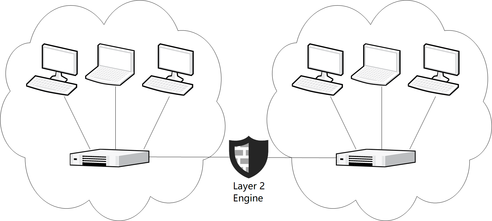 This example uses a Single Layer 2 Engine in an organization that has a large internal network. Administrators want to prevent hosts connected to different switches in the same network segment from communicating directly at the protocol level. Using the Layer 2 Engine makes it possible to implement access control for any Ethernet protocols between switches within the same network segment. There is no need to change the network topology.