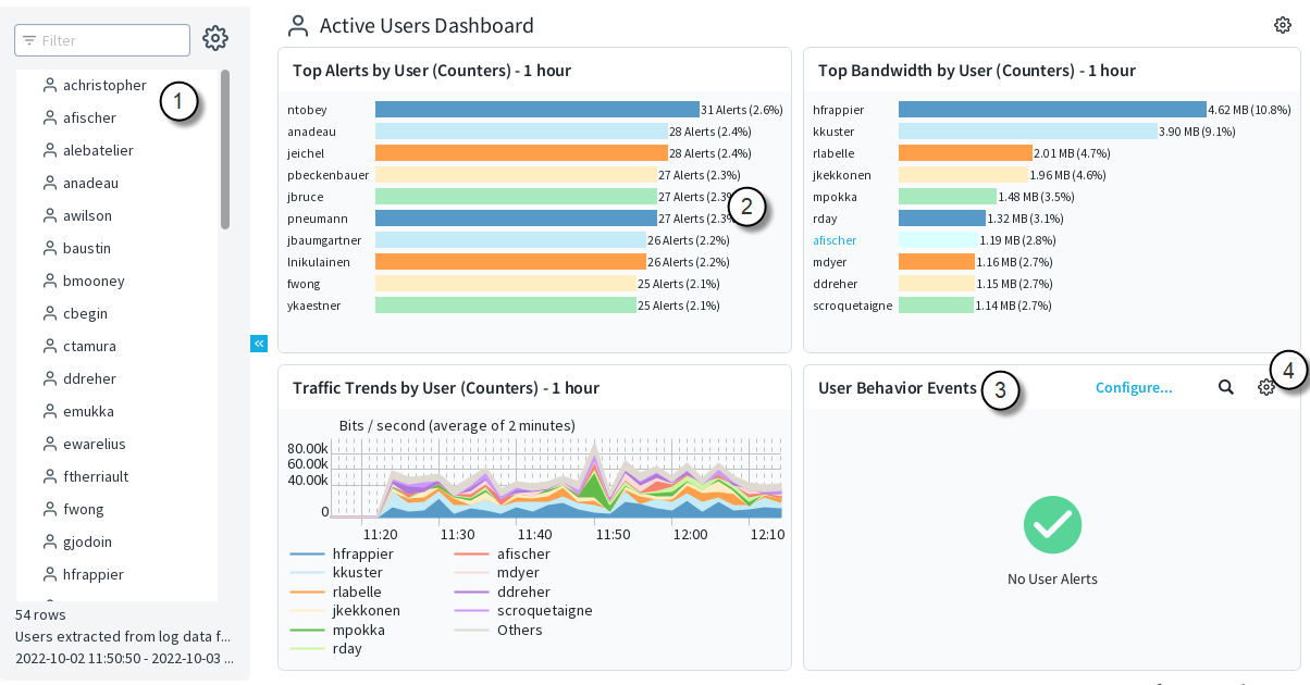 - When users have been active and have caused log data to be generated, they are shown in the Users list. You can configure the time period within which a user